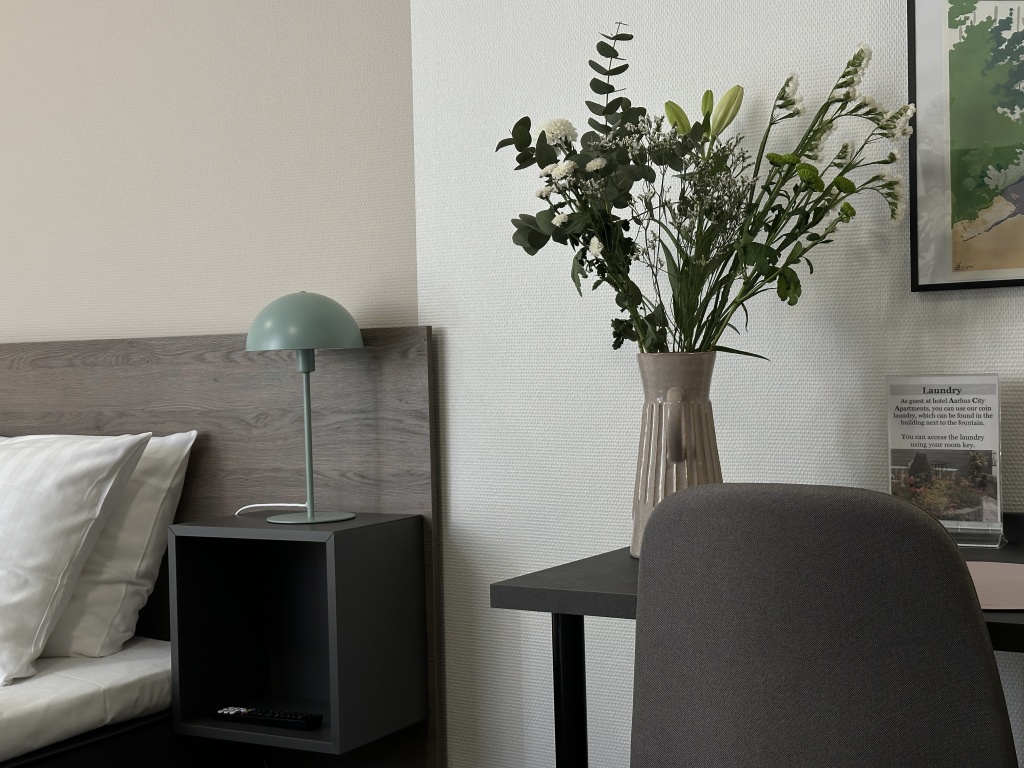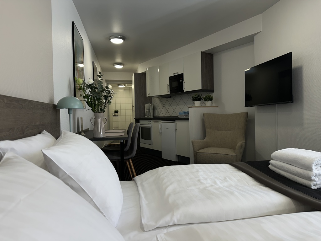 Hos Hotel Aarhus City Apartments tilbyder vi både enkelt- og dobbeltværelser og hotellejligheder med et, to eller tre værelser, alle indrettet med bad, køkken og køkkenudstyr. Du har mulighed for både korte eller længere ophold på vores hotel i Aarhus midtby, og her kan du føle dig hjemme fra første dag. Uanset hvor lang tid du skal være i Aarhus, bestræber vi os på, at du hos os får en base, der opfylder dine behov.